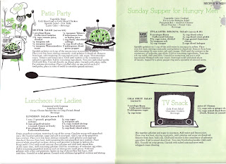 After inhaling nothing but homemade holiday pies, cookies and candy like a total asshole for the last few weeks (in preparation for my Santa Claus "bowl full of jelly" routine), it's now time to ease-up on the reins' dear (get it?) and start eating a little more healthy and sensibly-- and in 1958, Knox Gelatine Company (Johnstown, NY) had the perfect solution with this great little publication simply titled SALAD BOOK. Lots of tempt tasting recipes and cute girl illustrations, basic steps, helpful hints-- plus menus, dressings, garnishes, and more! Gorgeous design satisfies my other gnawing hunger!