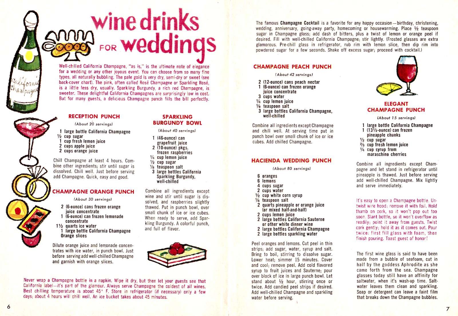 There's gotta be a few winos out there that follow this blog, and if so, I've scanned a variety of aged wine booklets (5 to be exact) all dated from around the 50's and 60's, and oh so graciously put them into one big post for you to douse yourself in all of their recipe and artistic splendor. Seriously beautiful illustrations and lettering styles here, and tons of bright and gay suggestions for your future booze-a-thons too-- just please please remember to eat and drink responsibly!